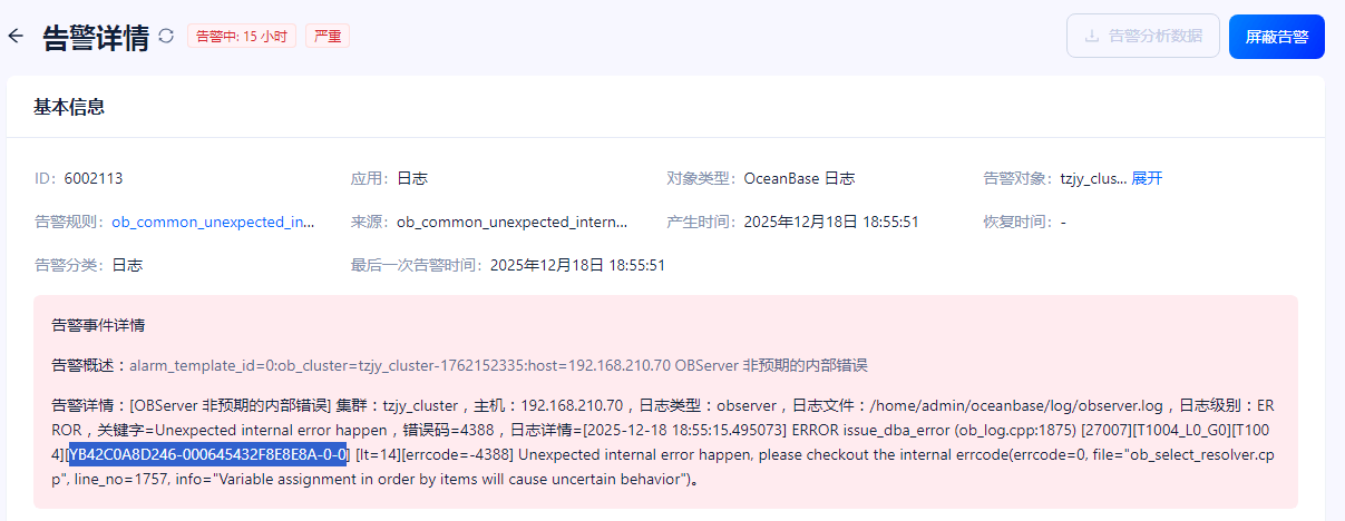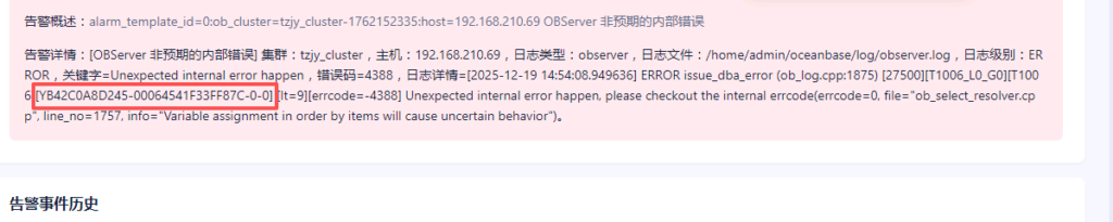 Note: 从OB OCP的告警信息在租户1006, SQL_ID可以从GV$OB_SQL_AUDIT中确认报错SQL.
