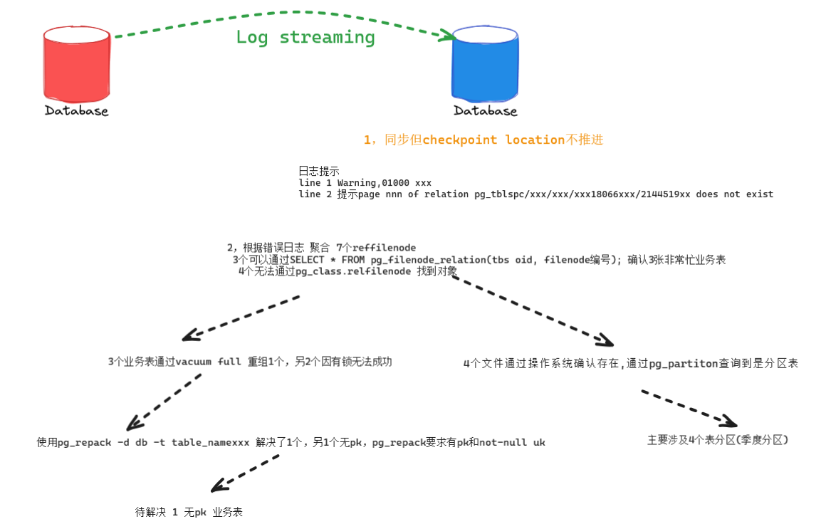 最后找停机窗口,对表做vacuum full 修复报错refilenode的表及分区,再重建备库。