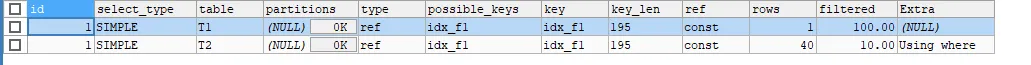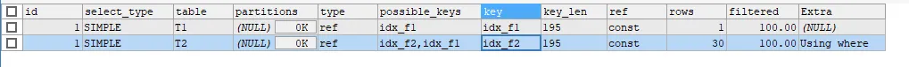 执行计划第一行完全没问题,T1.f1='2875205' 直接 const/ref 定位,第二行优化器选择了 idx_f2(单列索引),问题在这。